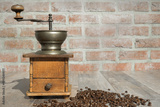 Old manual coffee grinder. Brick wall as a background with scattered coffee beans on the table