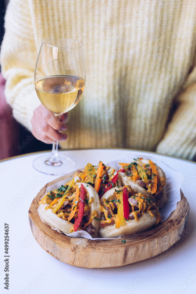 Woman is taking her lunch with bao buns and white wine in a restaurant