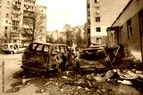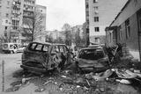 Damaged ruined and burnt out civilian transport in ukrainian city Chernihiv near Kyiv on north of Ukraine. Ruins during War of Russia against Ukraine. Burnt out cars after troops of enemy attack