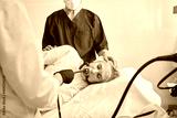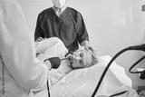 Woman laying at the bed while assistant holding special equipment at her mouth