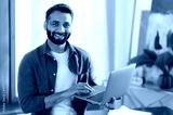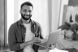 Portrait of a handsome positive Indian or Arabian successful man, programmer or freelancer in casual clothes, stands in his modern office near the table, holds an open laptop, looks at camera, smiling