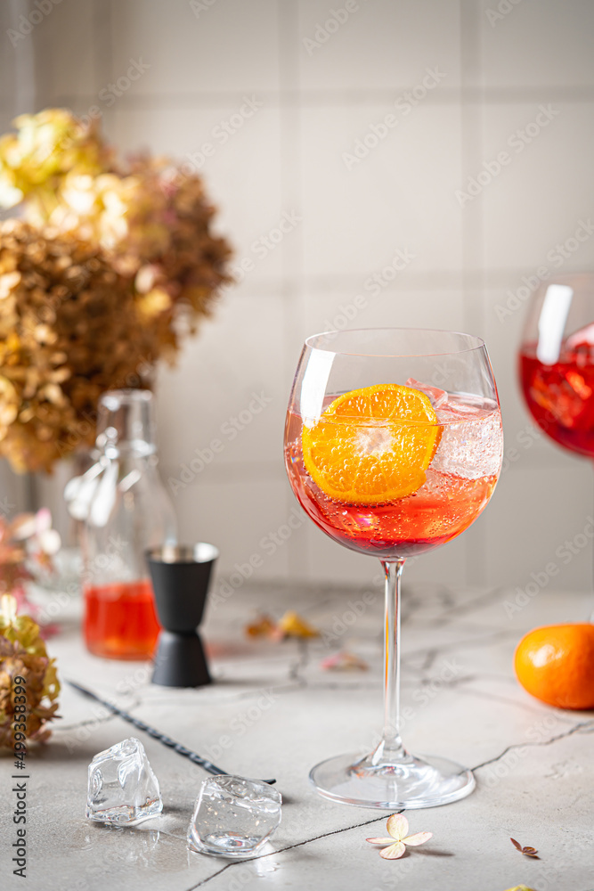 Italian Aperol Spritz cocktail with orange slices on gray stone table. Summer drink, homemade sangria. Copy space