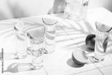 Mexican Gold Tequila with lime and salt on white background with shadows and copyspace.