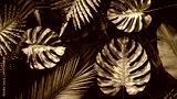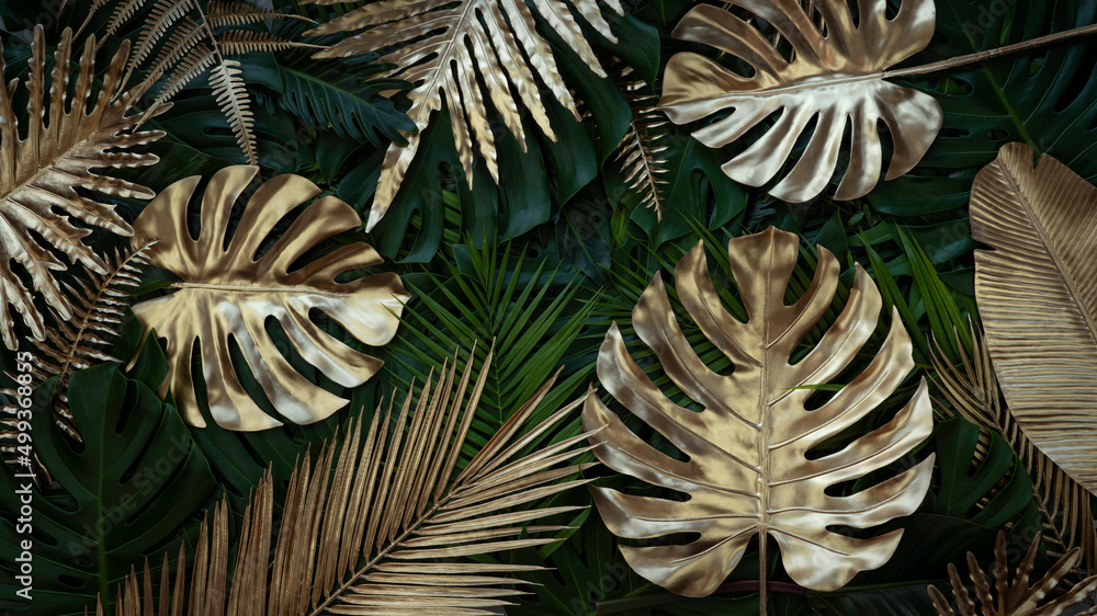Creative nature gold and green background. tropical leaf banner or floral jungle pattern concept.