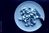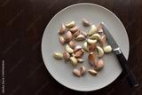 Garlic cloves with a knife on a plate. Alternative medicine. Cooking preparation concept. Flat lay top view photo.