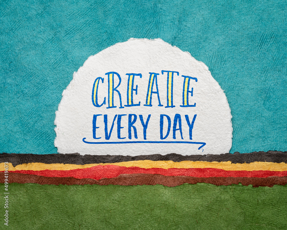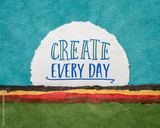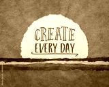 create every day - inspirational reminder or advice, handwriting on a circular sheet of watercolor paper against abstract landscape, creativity and personal development concept