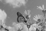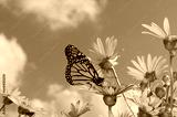 monarch butterfly and yellow flowers of the cup plant on a cloudy blue sky
