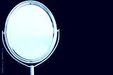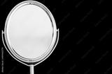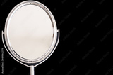 White metal mirror isolated on black background, closeup of ellipse shaped table or face mirror for make-ups. Empty and blank copy space or area for texts.