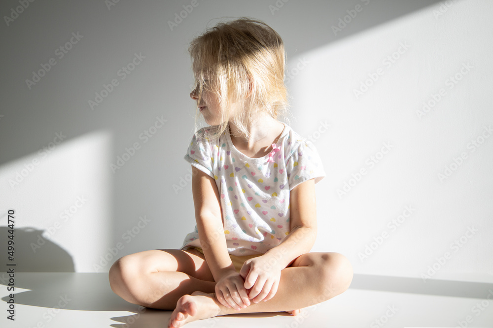 Child girl blonde turning away her face looks to the side while sitting on a white floor.