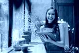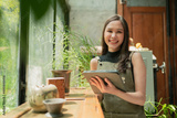 asian female adult creative designer happiness thinking work and reserach and make note of interesting ideas via tablet device,asian woman wokring casual relax at her home studio with window garden