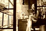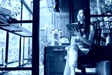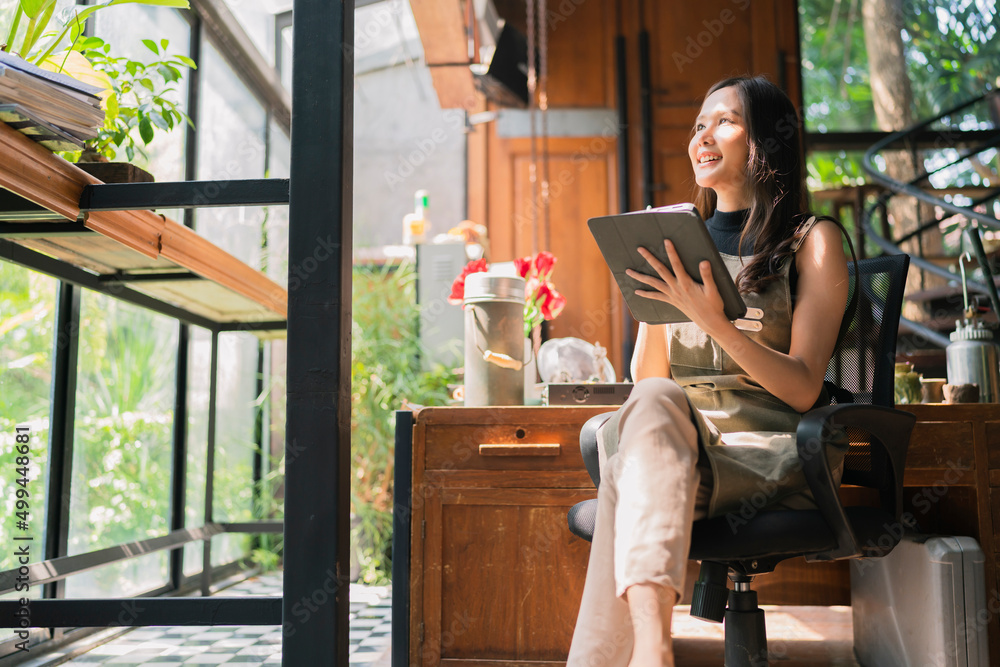 asian female adult creative designer happiness thinking work and reserach and make note of interesting ideas via tablet device,asian woman wokring casual relax at her home studio with window garden