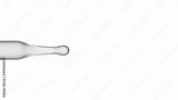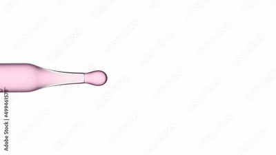 Horizontal macro shot of pink drop hanging from graduated lab dropper on white background | Abstract scin care cosmetics mixing concept