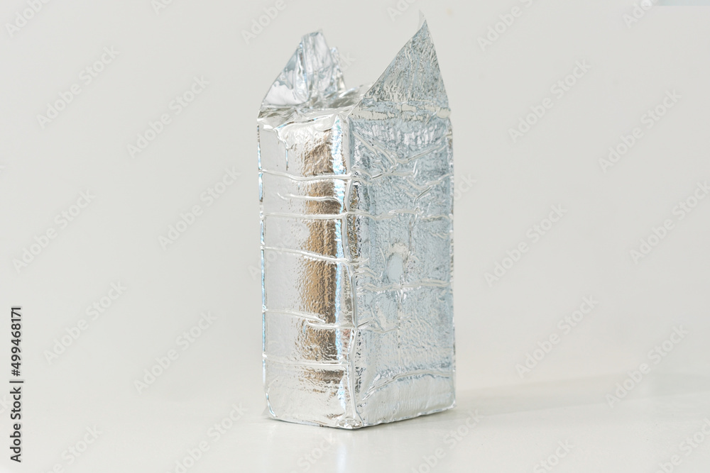 Blank foil vacuum sealed coffee on a white background. Wrap. Bag. Blank. Container. Empty. Isolated. Kitchen. Mock-up. Rectangular. Sack. Sealed. Template. Metal