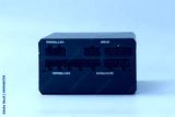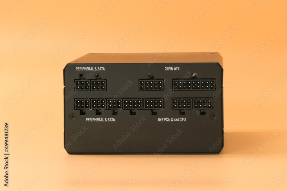 Back side of PC power supplier with SATA, PCi, CPU and Peripheral sockets on a yellow background. Industry. Watt. Connector. Object. Power Supply. Connect. Distribution. Complexity. Many. Plug. Black