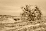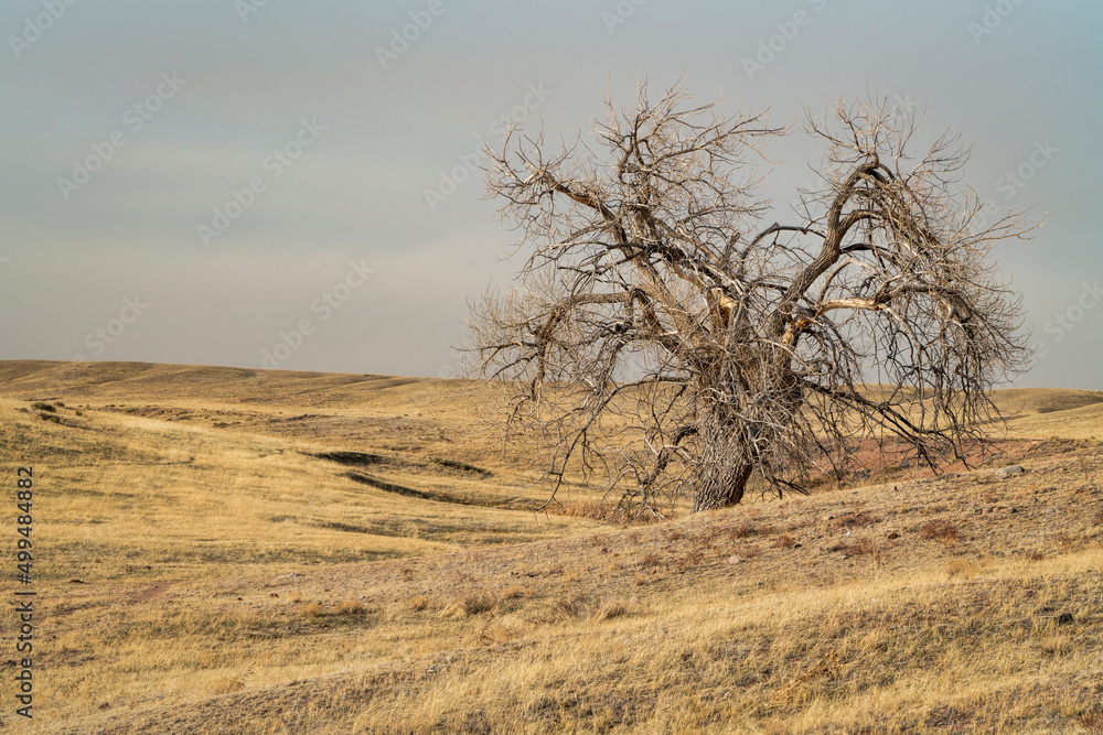 lonely tree in northern Colorado grassland, early spring scenery in Soapstone Prairie Natural Area near Fort Collins