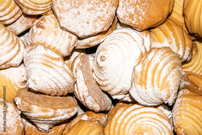 Shortbread cookies in powdered sugar.The background of shortbread cookies.Cookies in powdered sugar top view.
