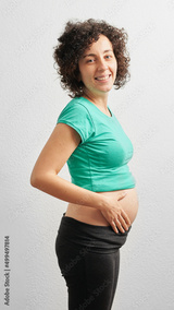 Peaceful pregnant caucasian woman hugging her tummy in front of isolated white background