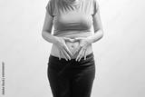 Unrecognizable peaceful pregnant caucasian woman hugging her tummy in front of isolated white background