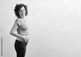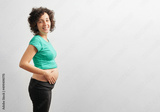 Peaceful pregnant caucasian woman hugging her tummy in front of isolated white background