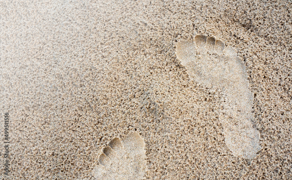 Closeup footprint in the sand beach background. Human foot step track on the wet sand texture with copy space, top view. Vacation, holiday, and summer concept.