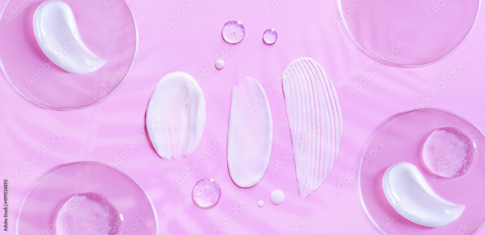 banner smear of cream round transparent drop of banner transparent gel serum in a petri dish on a pink background