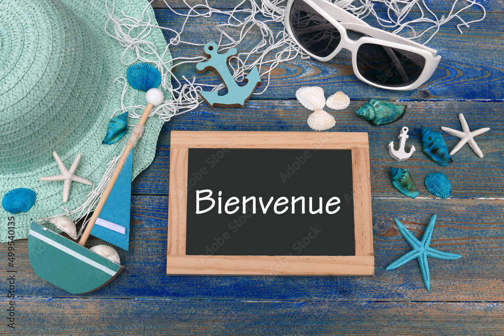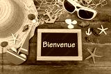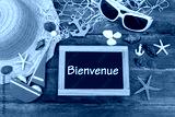Tableau noir avec le texte Bienvenue avec une décoration nautique sur une vieille planche de bois.