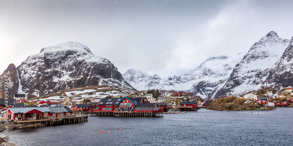 Moskenes Norway 02-28-2022. Old traditional fisherman's house called Rorbu at Moskenes in Lofoten islands. Norway.