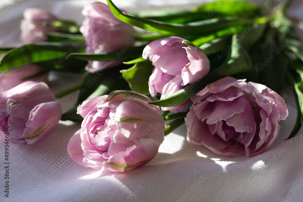 a bouquet of beautiful delicate fresh lilac tulips lies on a white fabric