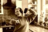 Joyful mature woman dancing in kitchen while listening music on headphones