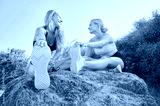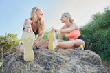A pair of two teenage women do their stretching exercise during a workout outdoors on a sunny summer day. Teenage friendship concept.