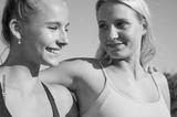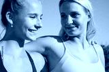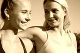 Couple of two young women hug each other after having finished their training exercise outdoors on a sunny summer day. Teenagers friendship concept.