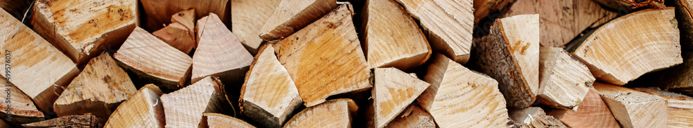 Natural wooden background. Chopped firewood. Firewood is stacked and prepared for winter.