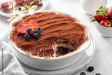 Tiramisu with strawberries and blueberries and berry layer, Italian dessert with ladyfinger biscuits, coffee and marscapone cheese in a casserole, powdered with cacao. Homemade.