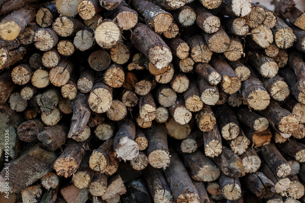Natural wooden background. Sawn firewood. Firewood is stacked and prepared for winter.