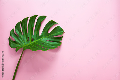 Natural green monstera leaf on pastel pink background, tropical leaf.