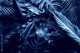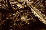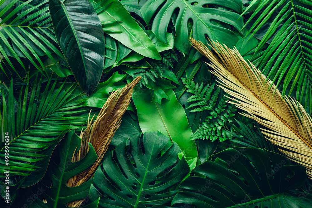 closeup nature view of green leaf and palms background. Flat lay, dark nature concept, tropical leaf