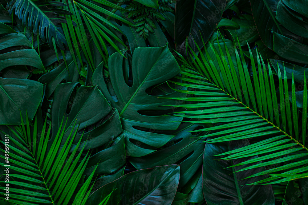 closeup nature view of green leaf and palms background. Flat lay, dark nature concept, tropical leaf