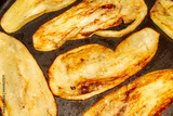 Eggplant fried in vegetable oil.Fried eggplant background.Fried eggplant with spices top view.