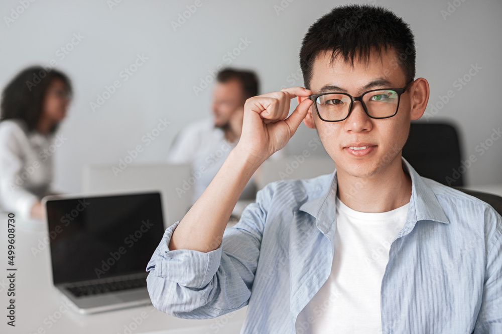 Smiling boy with laptop in office