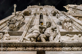 Detailed Low Angle View of Duomo Milan Cathedral Church in Milan, Lombardy, Italy. Beautiful Piece of Art on the Wall of the Facade.
