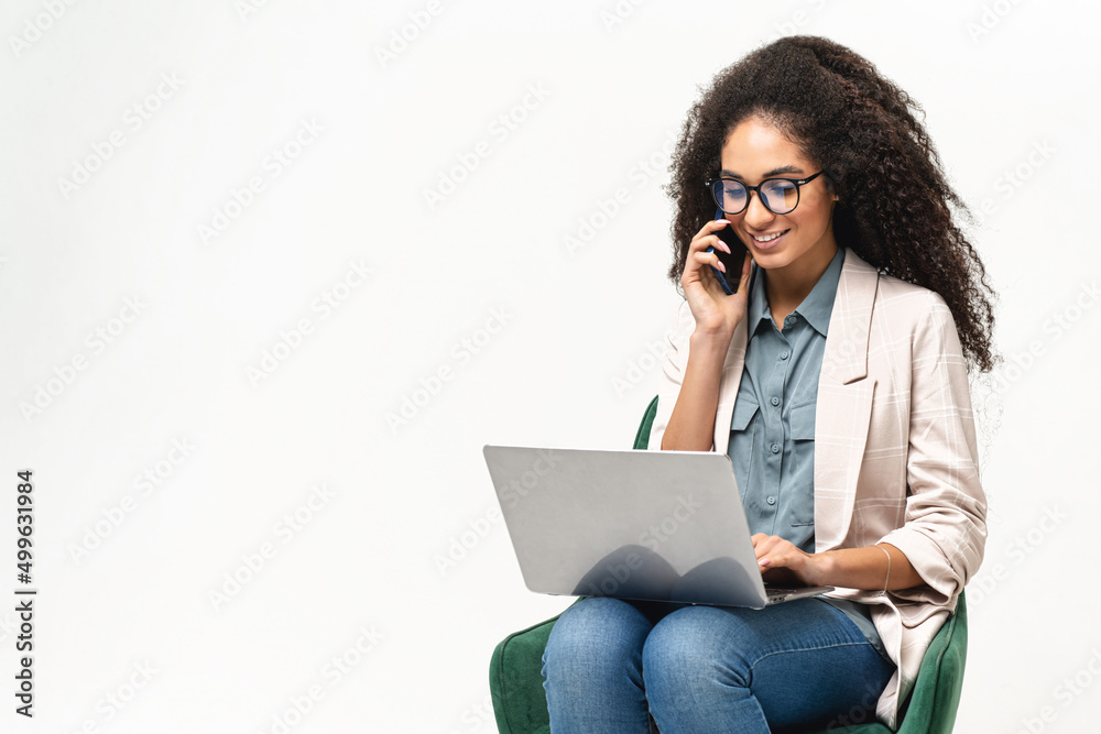 Confident African-American woman in smart casual wear using laptop and talking on the smartphone isolated on white background, female office employee typing and connecting with customers