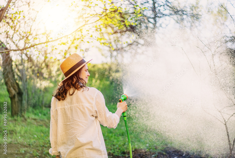Beautiful young happy woman in a hat taking care of the summer garden watering the lawn and plants from sprinkler