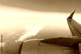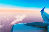 Plane In Sunset Sunrise Sky. View From Airplane Window On Height Flight Of Plane. Travel And Transportation Concept.