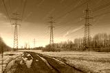 Rural dirt or unpaved road with mud and slush among towers of electric main in the countryside field on the background of blue sky with clouds and the forest with the wires in sunny or spring weather