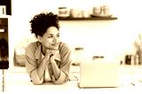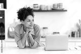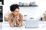 Lovely cheerful curly haired African American girl, in casual stylish clothes, female student or freelancer, stands at home in the kitchen near a laptop, looks away, dreaming, smiling happily