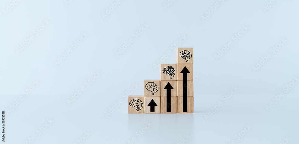 Cube with brain icon. Business strategy planning and solution or education knowledge success idea. Businessperson or student growth in improvement or development. Studying or learning achievement
