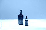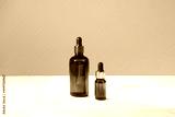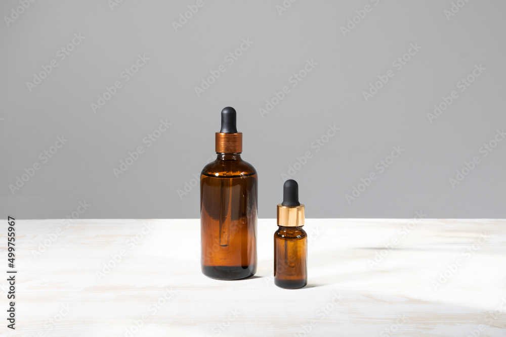 Two glass brown bottles of brown color with a cosmetic liquid product on a gray background, front view.