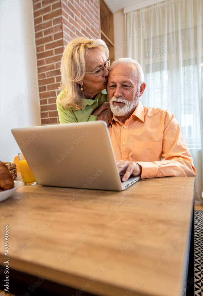 Smiling senior couple using laptop at home in living room.