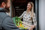 Mature man holding crate with vegetales and fruit and delivering it to woman standing at doorway.