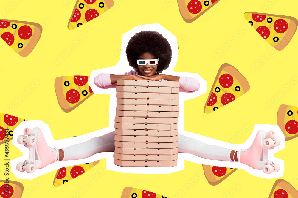 Creative image of lady sit pile carton package pizza innovative delivery concept isolated bright color background